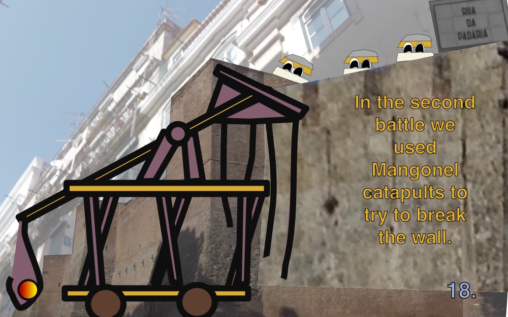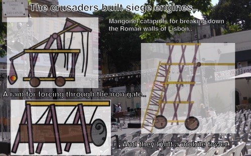 Os cruzados construíram máquinas de guerra como as catapultas mangonels para enfraquecerem a muralha Romana dos Mouros,